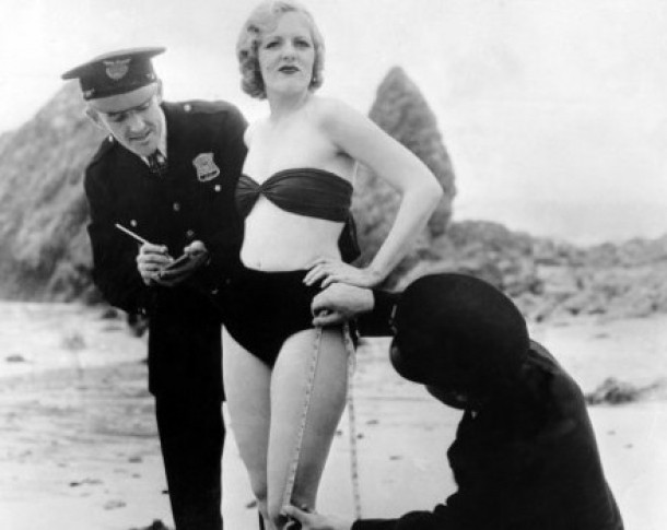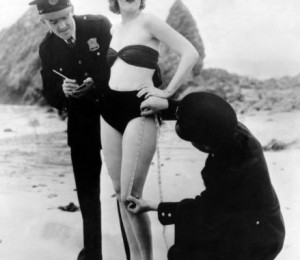 O fotografie din 1933 ne infatiseaza o tanara care este masurata la propriu de un reprezentant al politieil; acesta vrea sa fie sigur ca femeia nu este prea indecenta si ca nu isi expune prea multa piele.