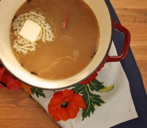 Intr-o cratita, combina cidrul, apa, batoanele de scortisoara, cuisoarele, nucsoara si sarea. Pune cratita pe aragaz, la foc mediu. Dupa ce da in fiert, ia cratita de pe foc si las-o pret de 15 minute sa se raceasca.