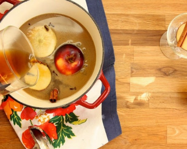 Pentru 4 portii ai nevoie de: 3 pahare de cidru de mere, 1/2 pahar de apa, 2 batoane de scortisoara, 10 cuisoare, un praf de nucsoara, un praf de sare, 2 linguri de unt, 5 linguri de rom negru, 2 linguri de zeama de lamaie, cateva felii de mar proaspat si batoane de scortisoara pentru decor.