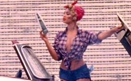 Fara sutien, cu camasa innodata sub sani, cu pantaloni scurti de blugi, cu sosete trei sferturi...