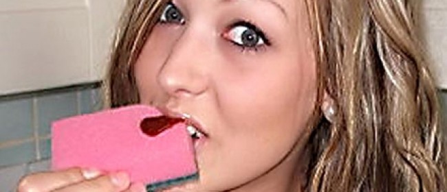 Detinatoarea recordului, Kerry Trebilcock, savureaza buretii de vase condimentati cu sos iute sau...