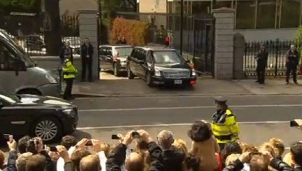 In timp ce oamenii se adunau, mai multi si mai multi, in fata ambasadei, sa il vada pe presedinte, acesta, impreuna cu sotia sa, Michelle, au ramas in masina, pana cand politia si securitatea s-au ocupat de inconvenient, declara RTE.