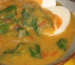 Se spala lintea si se scurge.Se toaca arpagicul si se ameteca cu chimionul si usturoiul, dupa care se prajeste amestecul in ulei, la temperatura medie, timp de 5 minute, amestecandu-se constant. Se adauga lintea. Se amesteca pana devine omogen.Se adauga coriandrul si 2-3 cani de apa si se lasa sa dea in clocot. Se reduce caldura si se lasa aproximativ 20 de minute sau mai mult pana se evapora apa.Se adauga sare si piper dupa gust, dupa care ametecul este pisat bine. Piureul de linte se pune intr-o tava, dupa care se amesteca cu ouale si se baga la cuptor, invelit in folie, timp de 20-25 minute. Se serveste cu legume marinate sau cu muraturi.