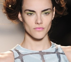 Pleoape in nuante de roz neon - excentricul Jeremy Scott propune un machiaj de tip cat-eyes reinterpretat, inlocuind tusul negru cu fard roz neon.