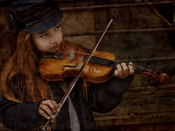 M-am oprit sa o ascult si sa ma uit putin la ea. Nu te puteai opri sa nu compari fata ei serioasa si melodia pe care o canta (destul de bine, desi chinuit) cu fetele copiilor iesiti in oras in acea zi de weekend, liberi si fara nicio ocupatie. Cel mai mare impact l-a avut (cel putin cata vreme m-am oprit eu) la familiile care iesisera impreuna cu copiii in oras. Un tata, cu mana pe gatul fetitei lui de aproximativ aceeasi varsta, nu stia cum sa gaseasca mai repede portofelul cu bani, in timp ce privirea lui atintita asupra fetitei cu vioara, spunea clar cat de multumit este ca fetita lui nu e in locul celei care canta. In cutia deschisa nu erau mai mult de 20 de lei… dar ziua de munca pentru micuta cu vioara abia incepuse.