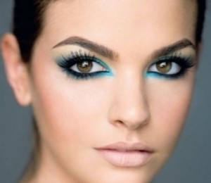 Pasul 2: Alege din paleta de culori, un fard albastru si aplica pe pleoapa superioara. Vei avea nevoie apoi de o nuanta de albastru electric, turcoaz pe care sa o aplici pe linia genelor superioare si inferioare. Daca ai un dermatograf de aceasta culoare, cu atat mai bine. Prelungeste in coltul interior si spre exterior. Contureaza ochii apoi cu un dermatograf negru si aplica un strat de rimel.