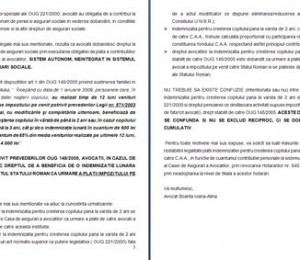 "Pana in prezent am beneficiat de indemnizatie de crestere copil pana la doi ani de la statul Roman in baza Ordonantei de Urgenta nr. 148/2005 doar prin simplu fapt ca realizam venituri impozabile, deci ca suntem platitoare de impozit pe venituri provenite din activitati independente si totodata, noi avocatii avand propriu sistem de asigurari sociale prin plata unei contributii lunare din veniturile realizate, am beneficiat si de la Casa de Asigurari a Avocatilor de indemnizatie de crestere copil pana la doi ani. Ambele indemnizatii sunt legale, una in baza OUG nr. 148/2005, cealalta fiind prevazuta prin Statutul Casei de Asigurari a Avocatilor.