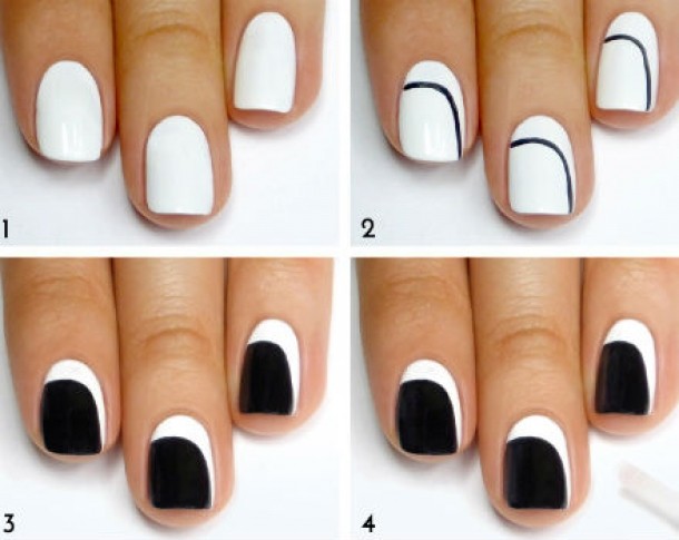 Pentru o astfel de manichiura ai nevoie de: lac de unghii, oja alba, oja neagra, oja neagra cu pensula subtire.