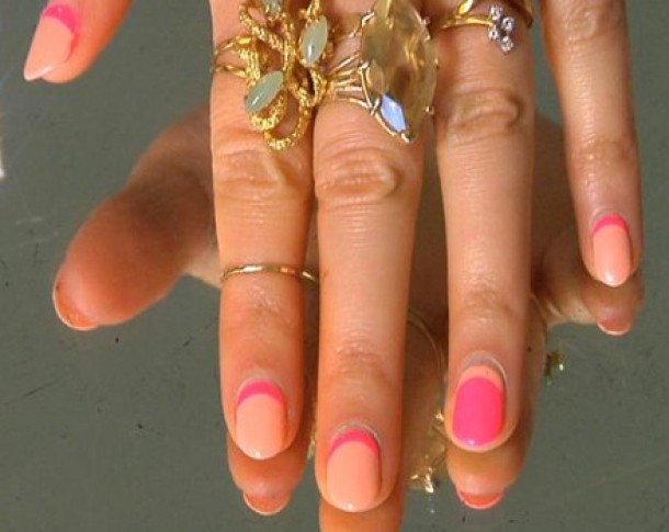 3. Dupa ce primul strat de oja s-a uscat, aplica o oja cu un ton mai inchisa, ori chiar intr-o culoare de contrast, lasand o portiune subtire, la baza unghiei, nedata cu oja.