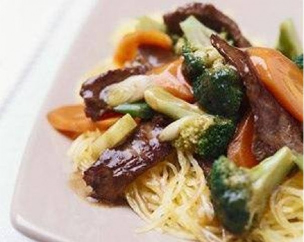"Idee de pranz gluten free - vita marinata in sos de soia, broccoli, morcov, praz si noodels de orez si dovlecel. Se marineaza vita in sos de soia terriaky, se pune in wok cu un puf de ulei de susan, se adauga legumele fierte in prealabil vreo 5 min si se lasa la preparat. Intre timp se pun noodels-ii de orez la inmuiat in apa fierbinte, se feliaza spaghetele crude de dovlecel la aparat si cand carnea e gata, se pune peste. Adaugati cu incredere sos de chilli", a scris Cori Gramescu in aceasta dupa-amiaza pe pagina ei de Facebook.