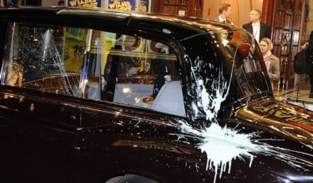 Charles si Camilla se duceau la un spectacol, insa au fost surprinsi de un grup de protestatari studenti care au aruncat pe vopsea pe masina, in care se afla familia regala si au spart geamul.
