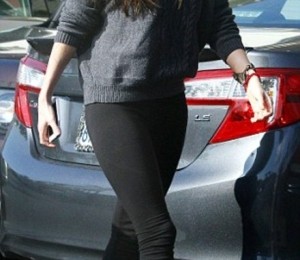 Megan purta o pereche de leggings negri trei sferturi care ar arata si cea mai mica imperfectiune si pe care i-a combinat cu o pereche de pantofi negri cu un toc de o intaltime ametitoare si un pulover gri si trebuie sa recunoastem ca are toate motivele sa fie mandra de silueta ei.
