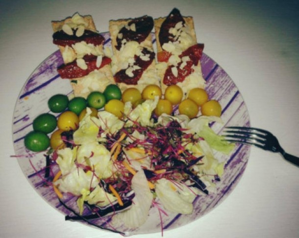 "Iata si o idee de mic dejun de post - salata mixta cu morcov, varza si frunze de ammaranth, rosii cherry galbene, masline, panite de ammaranth si castane, pasta de caju cu rosii uscate si fulgi de migdale. Pentru salata am folosit un sos de otet balsamic alb cu portocale si ulei de struguri", a explicat Cori Gramescu pe pagina oficiala de Facebook.
