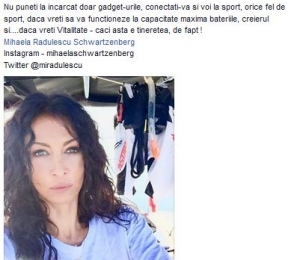 "Ultima zi de sporturi nautice, că prea vine toamna. Deşi, cu un costum gros de neopren, s-ar putea să mă prindeţi pe surfboard-ul electric şi în octombrie :))), când se coc strugurii:))) Nu puneţi la încărcat doar gadget-urile, conectaţi-vă şi voi la sport, orice fel de sport, dacă vreţi să vă funcţioneze la capacitate maximă bateriile, creierul şi....dacă vreţi Vitalitate - căci asta e tinereţea, de fapt!", scria Mihaela Rădulescu în data de 8 septembrie.