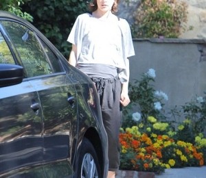 Imbracata cu o pereche de pantaloni de trening, un tricou gri si un top larg pe deasupra, vedeta pare sa nu se fi uitat in oglinda inainte de a iesi din casa.
