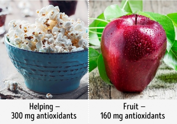 Un măr conţine 160 mg de antioxidanţi, în timp ce un bol de popcorn vine la pachet cu un aport de 300 mg de antioxidanţi.