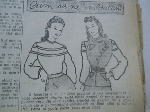 Cum bluzele anului 1949 sunt in proportie covarsitoare fara maneci, din materiale delicate si transparente, in Romania era absolut necesar sa fie exact pe dos. Bluze greoaie din barchet, cu print batranesc.
