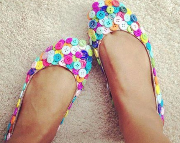 Ai nevoie de: nasturi de toate culorile si dimensiunile, lipici si o pereche de balerini simpli, din material textil.