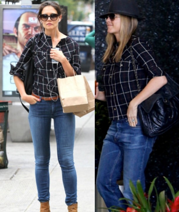 Astfel, in aceeasi zi, Katie Holmes si Jennifer Aniston au ales sa poarte o camasa neagra in carouri, insa fiecare a ales sa o combine cu blugi, insa modelul acestora si accesoriile pentru care au optat au facut diferenta intre cele doua tinute.