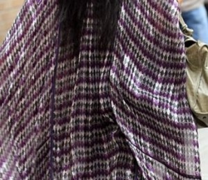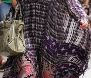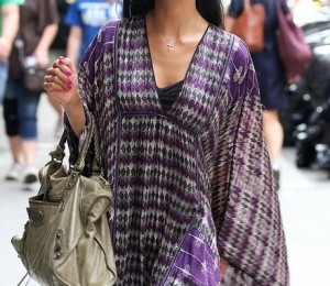 Rochia stil caftan, de culoare mov, aleasa de cantareata, aduce mai degraba cu un cearsaf colorat si ii ascunde artistei silueta in intregime.