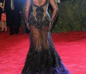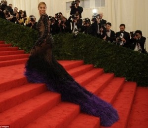 Beyonce a fost o aparitie cu adevarat spectaculoasa, dar stilistii nu s-au lasat prea impresionati si au comentat tinuta acesteia ca fiind una nu tocmai inspirata. Dornica de a-si arata silueta dobandita dupa sarcina, Beyonce a optat pentru o rochie care sa ii puna in evidenta cat mai mult corpul si chiar a lasat la vedere mai mult decat trebuia. Cantareata in varsta de 30 de ani a purtat o creatie semnata Givenchy, de culoare mov, semitransparenta, cu o trena lunga realizata din penaj.