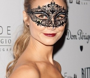Rochia stil corset, din tul negru, i-a pus in evidenta pielea bronzata, bratele si picioarele tonifiate, iar coafura aleasa i-a pus in valoare figura, ascunsa partial in spatele unei masti filigranate.