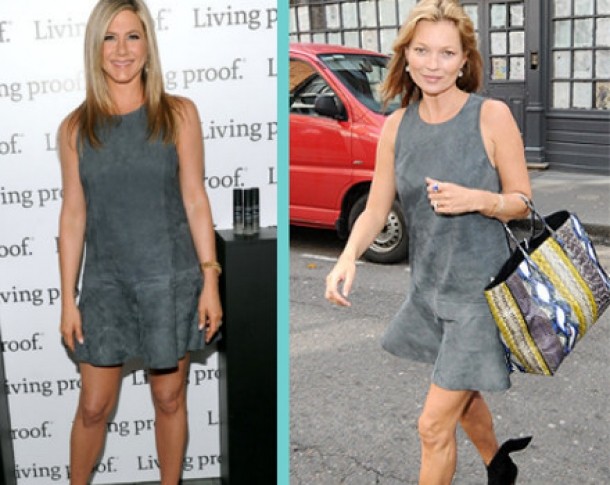 La doar o luna distanta, Jennifer Aniston si Kate Moss au imbracat aceeasi rochie gri din catifea, din colectia Balenciaga. Actrita a optat pentru aceasta tinuta la lansarea seriei de videoclipuri “Living Proof Good Hair Day”, ce a avut loc pe 8 mai, la New York, iar modelul in varsta de 39 de ani a ales rochia pentru o cina la Londra, pe 8 aprilie.