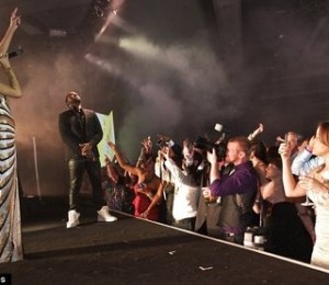 Rihanna a purtat de asemenea o rochie cu un slit in fata care ii permitea sa isi arate picioarele perfect tonifiate. Rochia era mulata, cu insertii aurii si cateva parti decupate in zona abdomenului.