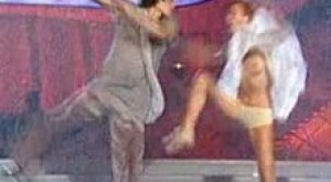 Nu chiar in costumul Evei, insa doar cu lenjerie intima, dresuri din plasa si niste cizme lungi....
