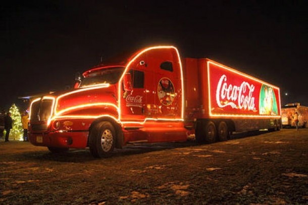 Caravana Coca-Cola il aduce pe Mos Craciun, care este insotit de ajutoarele sale si de un alai de trei camioane pline cu bauturi racoritoare si cadouri.