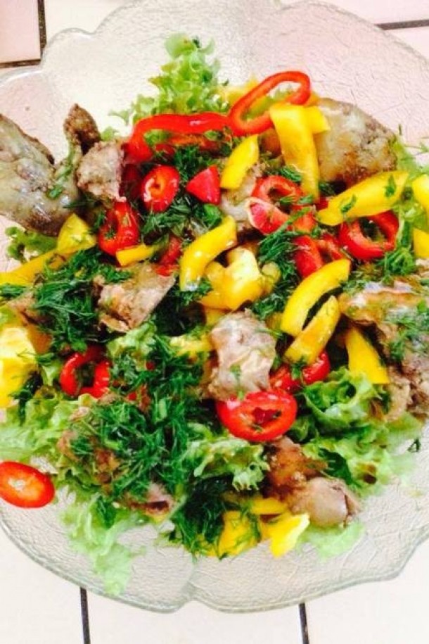 Foto 1 din " Carmen Bruma: Salata cu ficatei de pui si seminte de susan "