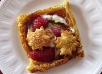 2. Dezgheţaţi foaia de aluat şi tăiaţi-o în două dreptunghiuri, pe mijloc, apoi fiecare dreptunghi pe diagonală, astfel încât la sfârşit să aveţi 4 triunghiuri.