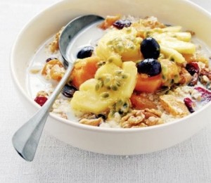 Se amesteca intr-un castron branza de vaci pana devine mai moale, apoi se adauga cerealele si laptele.Se serveste cu capsuni proaspete si cu cateva feliute de portocale. Foarte usor de preparat, rapid si satios.