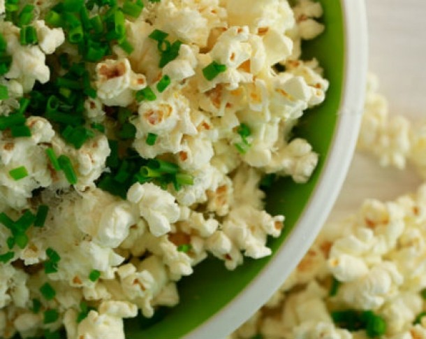 Ai nevoie de: 6 cani de popcorn facut in cuptorul cu microunde (fara branza, pizza ori alte arome), o jumatate de legatura de ceapa verde, 1 lingura de ulei de masline, 2 linguri de parmezan ras, 1 lingurita de piper negru.