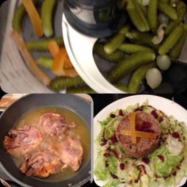 "Iata si o reteta pe care o fac des acasa, desi suna foarte fancy: terrine de rata confiata cu portocale si dulceata de ardei iute, sau cum se intalneste bucataria frantuzeasca cu ardeiul de la Campulung Muscel. In esenta se fierbe pulpa de rata intr-un amestec de untura de rata si supa de pasare concentrata, cu sare si ceapa, pana se desprinde carnea de pe oase.