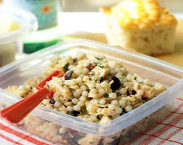 Ai nevoie de: 1 ceasca de cuscus, 1/4 masline maruntite, 2 linguri de patrunjel tocat, 2 linguri de ulei de masline, 1 lingura de zeama de lamaie, 1/4 lingurita de sare, 1/4 lingurita de piper, 1 catel de usturoi maruntit, 2 cani de piept de pui maruntit.