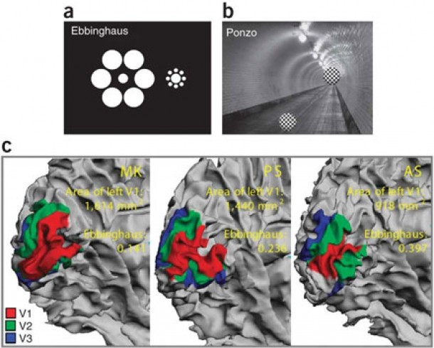 Pentru a vedea daca si cum influenteaza aceste diferente perceptia, cercetatorii au supus un grup de voluntari la o serie de experimente. Gratie imaginilor obtinute in urma rezonantei magnetice, cercetatorii au putut sa masoare suprafata cortexului vizual primar al subiectilor, identificand variatii notabile. Astfel, cu cat aria cervicala delimitata de cortexul vizual este mai mica, cu atat subiectii sunt mai predispusi sa aiba iluzii optice.