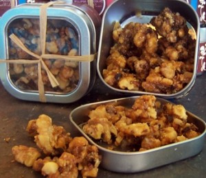 Se bate albusul si se amesteca cu condimentele. Se tavalesc nucile prin amestec, apoi se baga la cuptor intr-o tava si se lasa 20-25 minute, timp in care aveti grija sa fie coapte uniform si pe o parte si pe cealalta. Se serveste cu un pahar de vin rosu, la gura sobei!