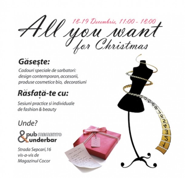 La All You Want for Christmas vei putea sa arunci o privire prin tolba lui Mos Craciun si sa alegi cadouri speciale pentru toti cei dragi tie de la haine cu design contemporan, accesorii si bijuterii diafane, decoratiuni cu miros de Craciun si pana la produse naturale de ingrijire a pielii atat pentru ladies, cat si pentru domni (pe care le poti testa chiar acolo).
