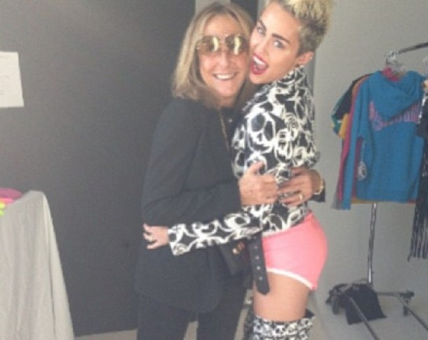 Tinuta purtata de Miley este una iesita din tipare, combinand o pereche de cizme inalte si o jacheta de motociclist din piele - ambele cu imprimeu alb-negru - cu lenjeria intima roz a artistei, de parca ar fi uitat intentionat sa poarte pantaloni.