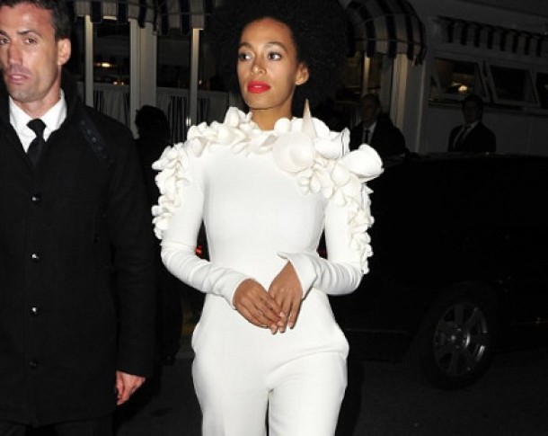 Astfel, Solange a optat pentru o tinuta all-white, pe care a completat-o cu o pereche de sandale nude si un ruj indraznet.
