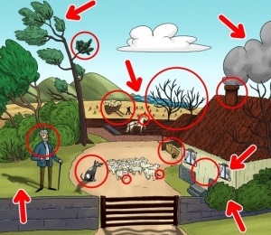 Tips: Fii atentă la logica din imagine. Sunt o grămadă de mici detalii care nu pot exista în realitate (de exemplu, uit-te la câmp). Dacă vrei să te verifici uită-te la rezolvare, dar nu trișa înainte.
