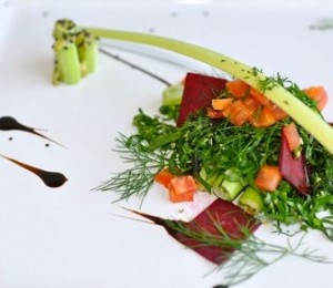 "Am luat o mina buna de frunze de spanac, bine spalate, tocate marunt cu un cutit ceramic si le-am uns cu pensula cu o vinegreta din ulei de masline presat la rece, shoyu, suc de lamiie si niste piper proaspat macinat. Pensula imi da precizie si ma impiedica sa exagerez cu uleiul. Spanacul astfel maruntit seamana cu niste alge de mare, ce se servesc in reastaurantele de sushi, asa ca, dupa model asiatic, l-am imperecheat cu o mina buna de susan alb, pentru contrast si mai mult calciu. Am asezat apoi spanacul pe niste tije de praz umplute cu brinza fermentata (din nuci de macadamia rehidratate, blenduite cu suficienta apa cit sa devina o pasta moale si lasate la scurs si maturat cu o lingurita de probiotice, sare de Himalaya si zeama de la o lamie, pina a doua zi) si am garnisit salata cu fire rebele de marar pe margini, carpaccio de sfecla si rosii maruntite, stroptite toate cu lamiie, sare roz si putin piper de cayenne. Joaca de fetite cu codite.", a scris aceasta pe blogul personal.