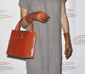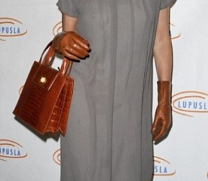 Rochia gri, dreapta si cu guler din blana, a fost combinata cu o pereche de pantofi peep-toe manusi portocalii si o geanta asortata. Cireasa de pe tort a fost palaria cu banda aurie.
