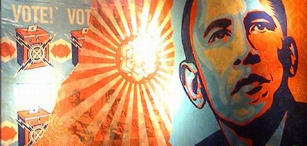 Lucrarea, realizata in culorile drapelului SUA, a fost creata de artistul stradal Shepard Fairey, special pentru campania de sustinere a candidaturii lui Obama la presedintie, conform Newsin.