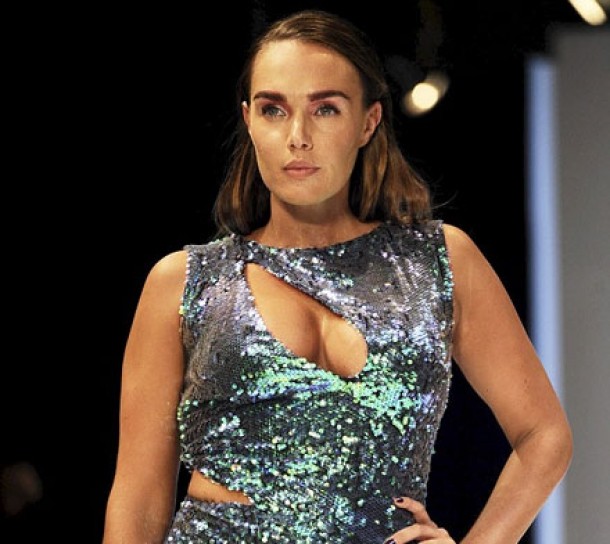 A defilat pe catwalk imbracata intr-un jumpsuit albastru, foarte stralucitor, cu o taietura indrazneata intr-o parte si in zona decolteului, care insa nu o avantaja deloc, multe persoane facand glume pe seama sanilor ei prea mari, in timp ce altii au considerat intreaga aparitie a fi de prost-gust.