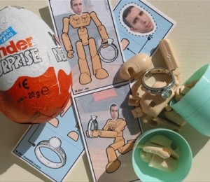A desfacut apoi cu grija ambalajul unui ou de ciocolata si l-a rupt in doua, introducand la mijloc jucaria, dupa care l-a lipit si ambalat la loc, oferindu-l partenerei. Jucaria era insotita de instructiuni de utilizare, care indicau, asa cum puteti vedea in galeria foto, ca robotul final trebuia sa stea in genunchi, cu inelul in mana.