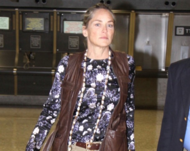 Imbracata intr-o tinuta casual, compusa dintr-o pereche de pantaloni bej, o camasacu imprimeu floral si o vesta din piele, Sharon Stone a aparut in fata fotografilor cu un machiaj minimalist, un machiaj pe care prea putine femeie de 25-30 de ani ar avea curajul sa il abordeze si are toate motivele pentru care sa fie mandra.