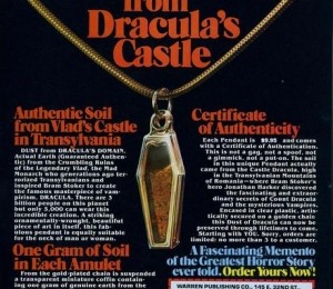 Revista Famous Monsters of Filmland avea o pagina intreaga dedicata unei reclame; anuntul avea o oferta foarte neobisnuita, iar cititorii puteau comanda prin posta, in anul 1981, cate grame de sol din castelul lui Dracula doreau. Reclama spunea ca solul este autentic, ba chiar amuleta care continea un gram de pamant era insotita si de un certificat de autenticitate.