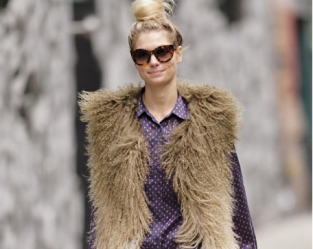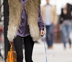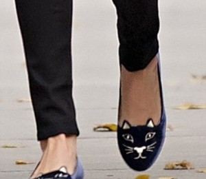 Modelul in varsta de 26 de purta un outfit casual-chic compus dintr-o perechee de pantaloni negri, o camasa mov si o vesta de blana. Excentricitatea tinutei a fost data de perechea de balerini care aveau desenati in partea din fata trasaturile unei pisicute si aveau adaugate chiar si urechile.